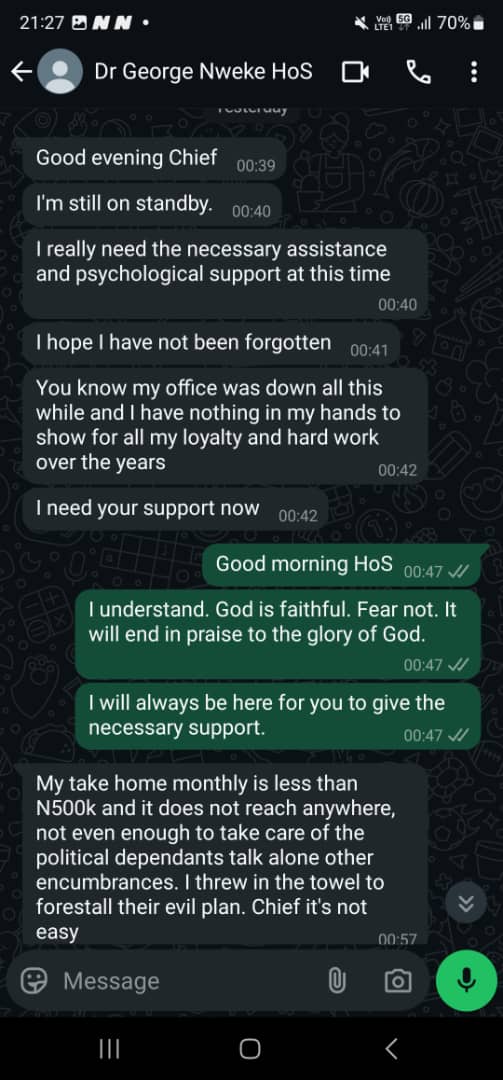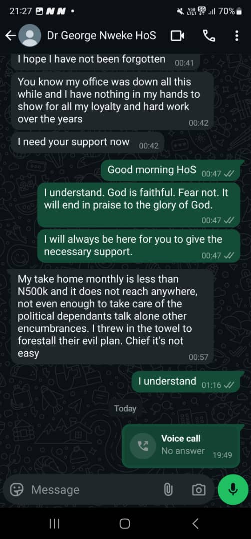 The chats suggested that Mr Nwaeke had been reaching out to Ehie for funds and support in exchange for his loyalty, claiming that he earns N500,000, which was inadequate to meet his needs.