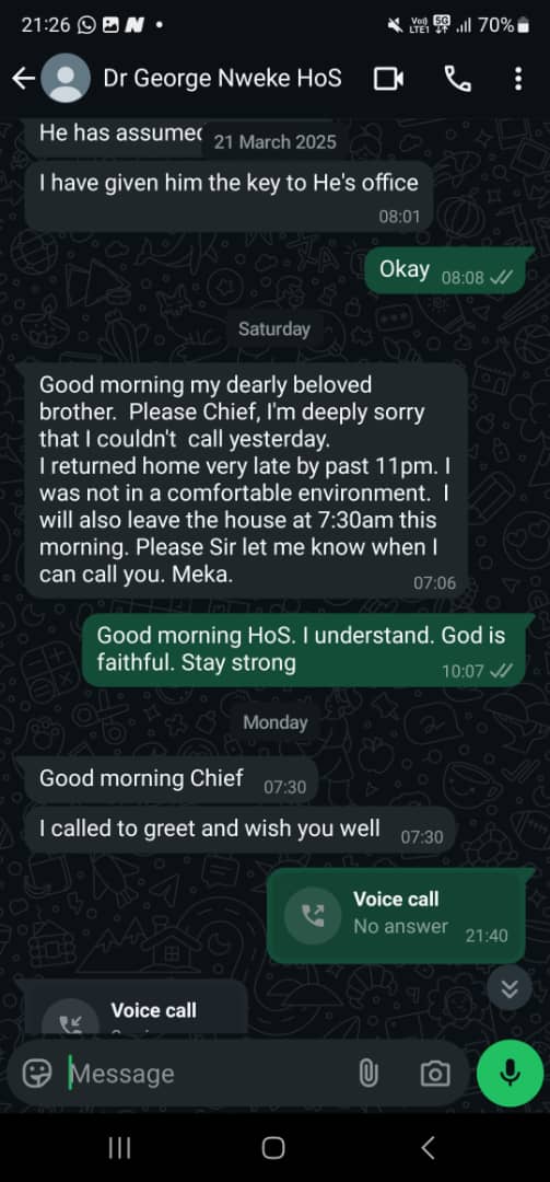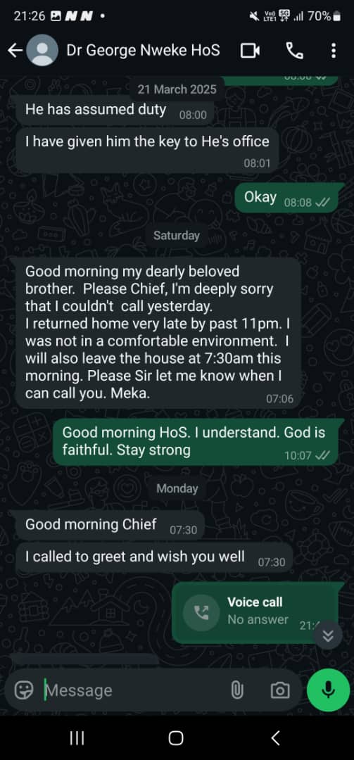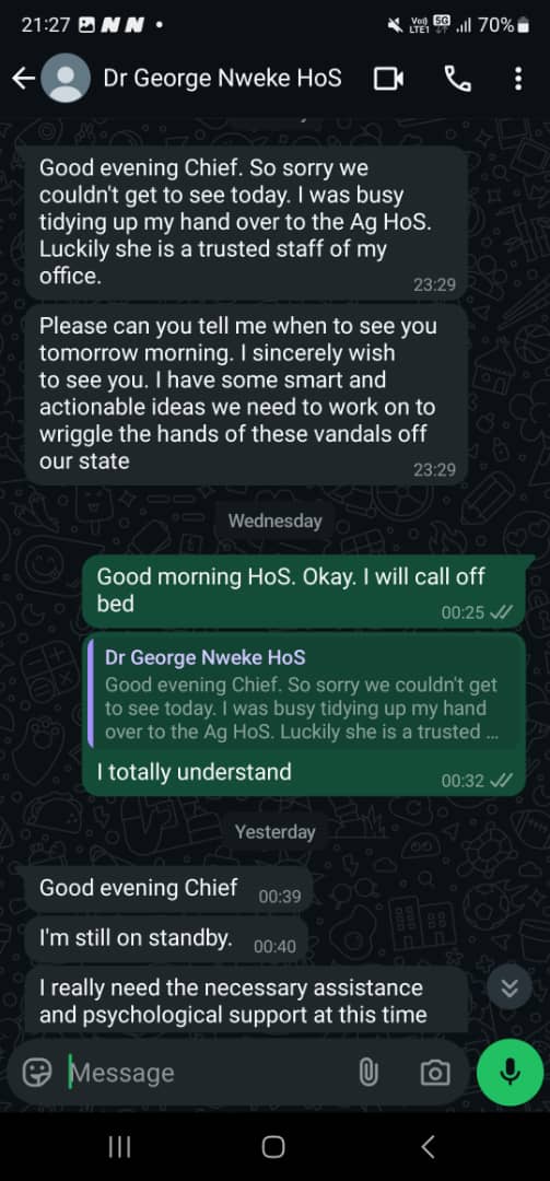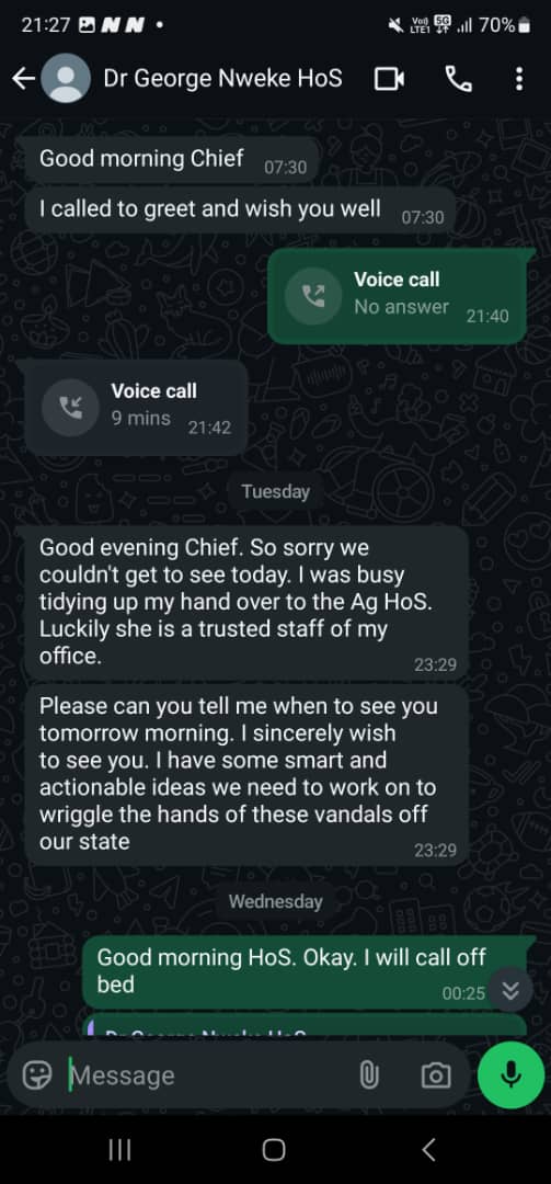 The governor backed his position with screenshots of chats said to have been between Mr Nwaeke and his Chief of Staff, Ederson Ehie. The chats suggested that Mr Nwaeke had been reaching out to Ehie for funds and support in exchange for his loyalty, claiming that he earns N500,000, which was inadequate to meet his needs.